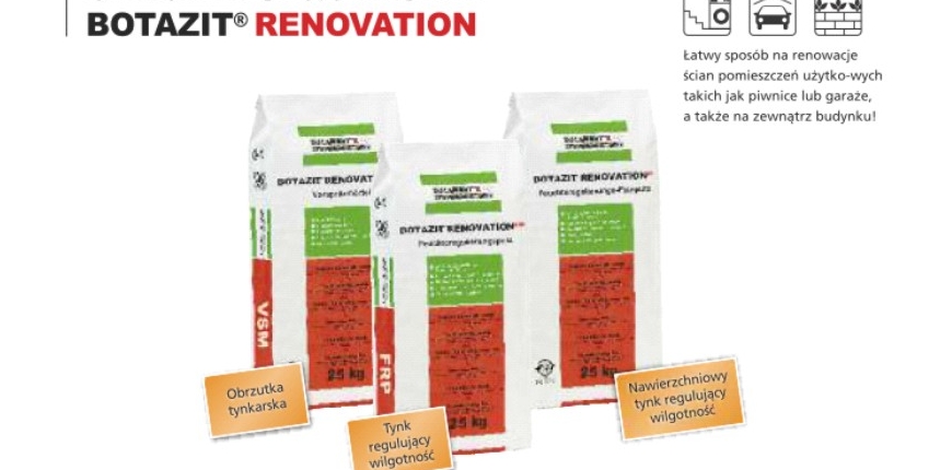 System tynków regulujących wilgotność BOTAZIT ® RENOVATION FRP znajduje zastosowanie przy renowacji zawilgoconych murów. Właściwości systemu, dzięki szczególnej geometrii porów, umożliwiają odparowanie wody na powierzchni tynku, a także transport soli aż do powierzchni tynku, nie blokując przy tym kapilar (stąd nie mamy tu do czynienia z tzw. tynkiem traconym). W przypadku bardzo wysokiego obciążenia solami, mogące pojawić się wykwity solne można łatwo usunąć miotłą lub odkurzaczem. Ponadto tynk regulujący wilgotność BOTAZIT ® RENOVATION FRP może pochłaniać nadmiar wilgoci zawartej w powietrzu, która w momencie wietrzenia pomieszczenia będzie z powrotem oddana.